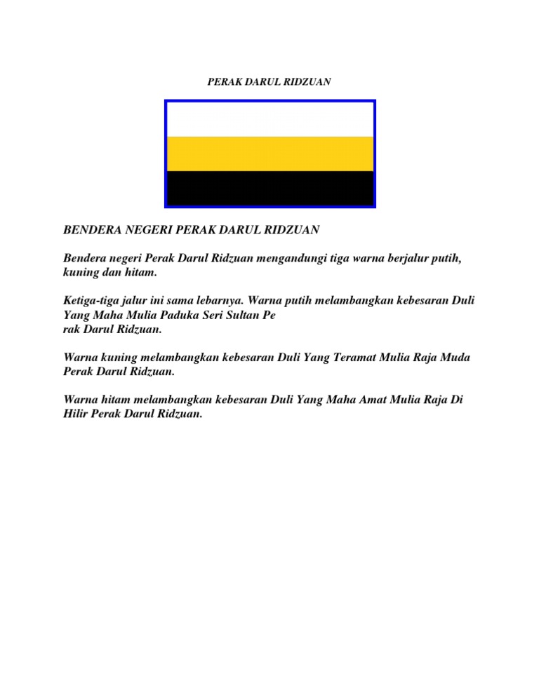 Bendera negeri Perak Darul Ridzuan mengandungi tiga warna berjalur putih kuning dan hitam. Setiap lambang dan warna yang terdapat pada bendera Malaysia mewakili. 7763 total views 18 views today.